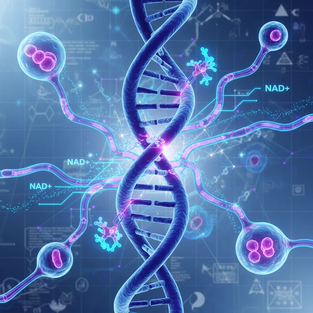- Reparación del ADN: la enzima PARP1, esencial para reparar las roturas del ADN que ocurren miles de veces al día en cada célula, consume NAD+ como sustrato. Cuando el NAD+ es insuficiente, la reparación del ADN se compromete3.