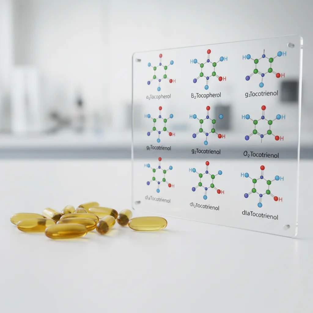 La vitamina E no es un compuesto único sino una familia de 8 moléculas: 4 tocoferoles (alfa, beta, gamma, delta) y 4 tocotrienoles (alfa, beta, gamma, delta). El 90% de los suplementos contienen solo dl-alfa-tocoferol sintético, ignorando al gamma-tocoferol (el más abundante en la dieta) y a los tocotrienoles (con propiedades neuroprotectoras y anticancerígenas únicas).