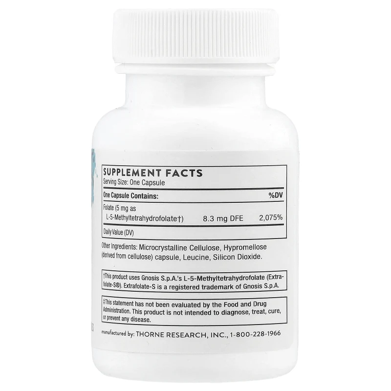 Thorne utiliza L-5-metiltetrahidrofolato de grado clínico, fabricado en instalaciones certificadas de Estados Unidos. La fórmula es libre de gluten y contiene excipientes mínimos. La calidad del 5-MTHF es crucial porque las impurezas o formas inactivas pueden reducir significativamente la eficacia del producto.