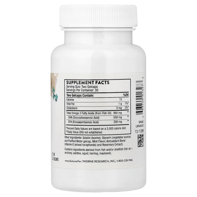 El aceite de pescado de Thorne proviene de fuentes sustentables y es purificado mediante destilación molecular para eliminar contaminantes. Las gelcaps contienen gelatina bovina, glicerina vegetal y un blend antioxidante de vitamina E y extracto de romero para máxima estabilidad. El sabor a menta minimiza cualquier regusto.