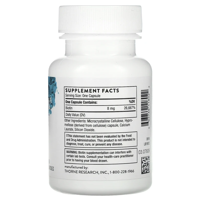 La biotina, también conocida como vitamina B7 o vitamina H, es una vitamina hidrosoluble del complejo B que actúa como cofactor esencial para las enzimas carboxilasas involucradas en el metabolismo de los macronutrientes. La fórmula de Thorne proporciona 8000 mcg (8 mg) de biotina por cápsula, una dosis de alta potencia diseñada para apoyar significativamente la salud del cabello, las uñas y la piel, así como el metabolismo de carbohidratos, grasas y proteínas.