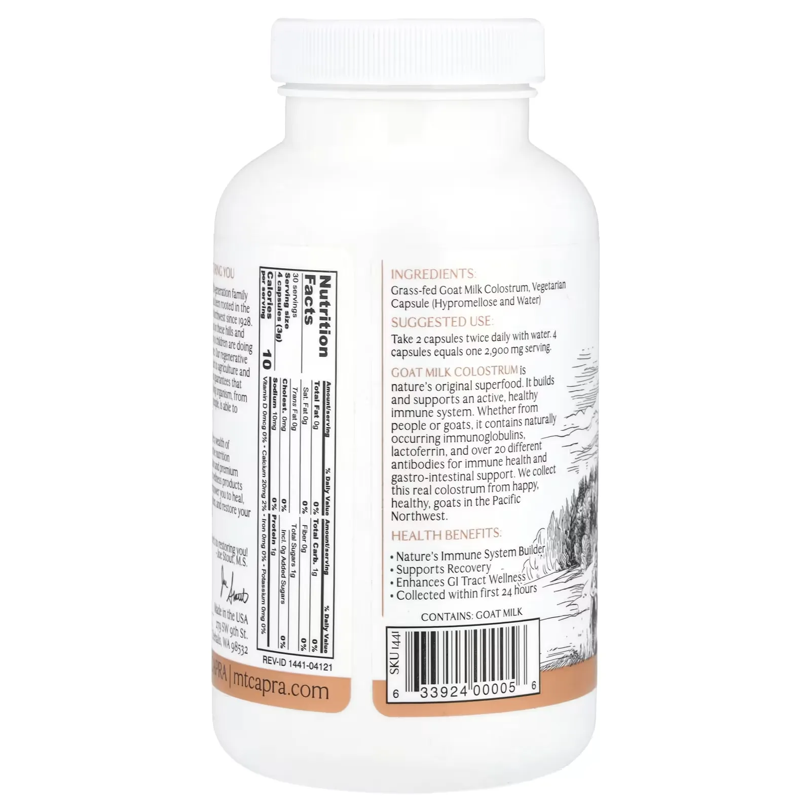 Mt. Capra es una granja familiar con casi un siglo de tradición en el noroeste del Pacífico. Su enfoque de agricultura regenerativa prioriza suelos vivos, bienestar animal y manejo responsable del entorno. El calostro procede de cabras alimentadas con pasturas y se obtiene dentro de las primeras 24 horas, manteniendo su perfil bioactivo. La marca destaca por su compromiso con ingredientes limpios (sin OGM, sin hormonas añadidas, sin soya y gluten-free) y procesos que conservan la integridad de los compuestos sensibles. El resultado es un suplemento premium, consistente y confiable para quienes buscan apoyo inmunitario y bienestar digestivo sin comprometer calidad.