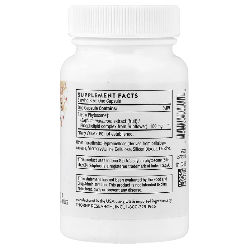 Fabricado en instalaciones certificadas NSF en Estados Unidos con materia prima Siliphos de Indena, este producto representa el estándar de oro en suplementación de cardo mariano. Cada cápsula proporciona 180 mg de fitosoma de cardo mariano (equivalente a silibina de alta biodisponibilidad) en cápsula vegetal libre de gluten.