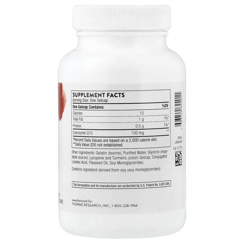 La CoQ10 de Thorne viene en gelcaps con una base de ácido linoleico conjugado (CLA) y aceite de linaza, que proporcionan un medio lipídico que mejora significativamente la absorción. Como la CoQ10 es liposoluble, su absorción depende de la presencia de grasas. La formulación de Thorne elimina la necesidad de tomar el suplemento obligatoriamente con una comida grasa, aunque siempre es recomendable hacerlo para maximizar la absorción.