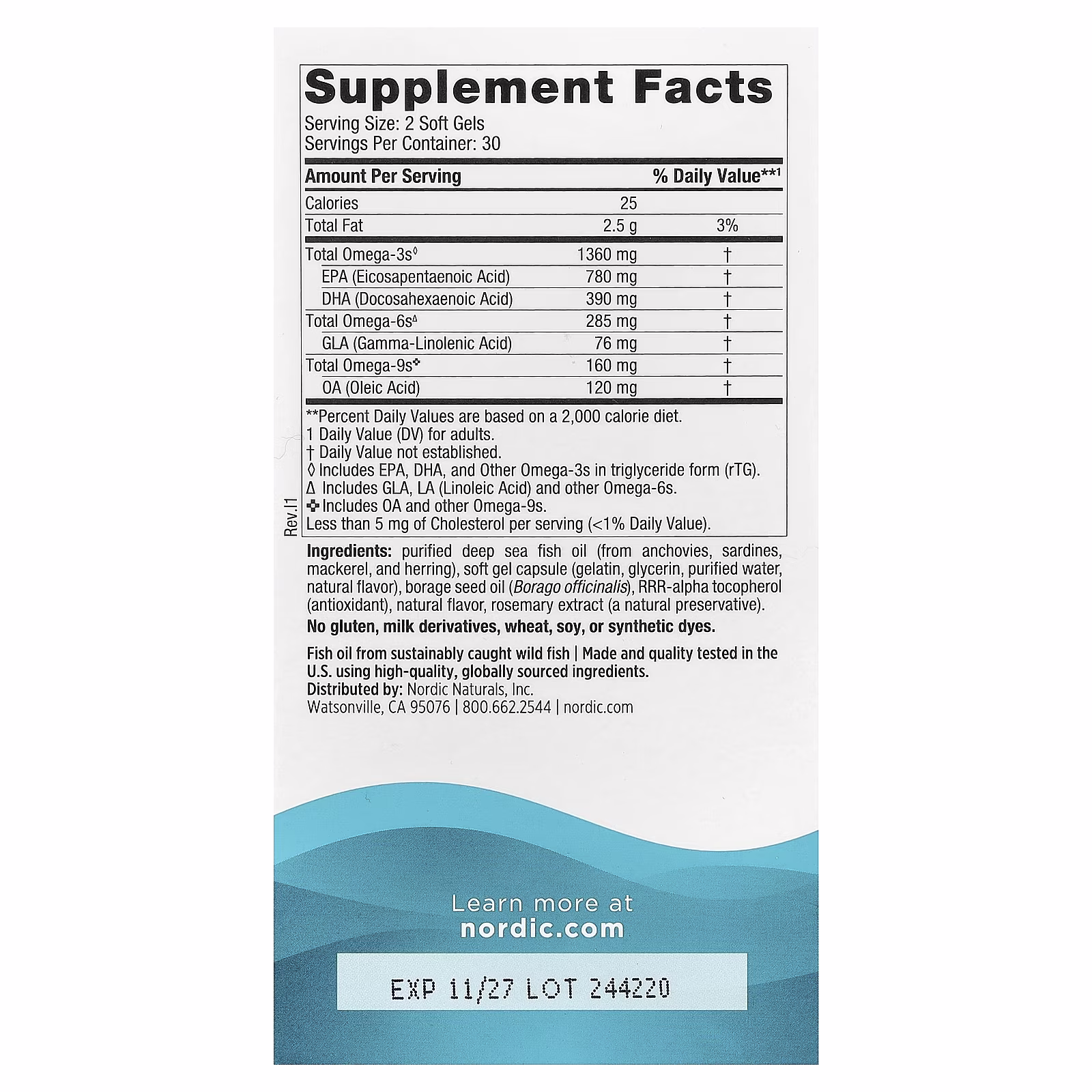 Aceite de pescado purificado de aguas profundas (de anchoas, sardinas, caballa y arenque), cápsulas blandas cápsulas (gelatina, glicerina, purified agua, saborizante natural), borage seed oil (Borago officinalis), RRR-alfa tocoferol (antioxidante), saborizante natural, extracto de romero (un conservante natural). Sin gluten, leche derivatives, trigo, soja, o synthetic dyes. Fish oil from sustainably caught wild pescado | Made y quality tested in the U.S. using high-quality, globally sourced ingredientes. Este producto y sus ingredientes no contienen genes ni proteínas modificadas genéticamente.