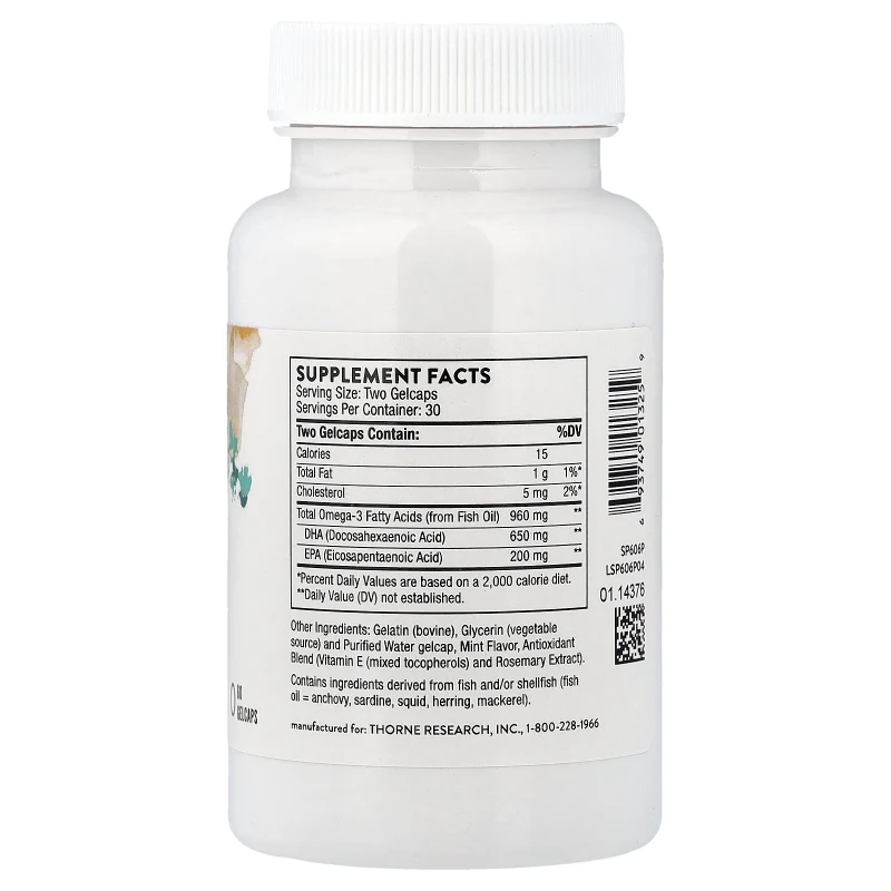 Las gelcaps de DHA Prenatal de Thorne incluyen sabor a menta natural para minimizar el reflujo y el sabor a pescado, una queja frecuente durante el embarazo cuando las náuseas y la sensibilidad a olores son comunes. La cápsula de gelatina bovina con glicerina vegetal facilita la deglución y la digestión.