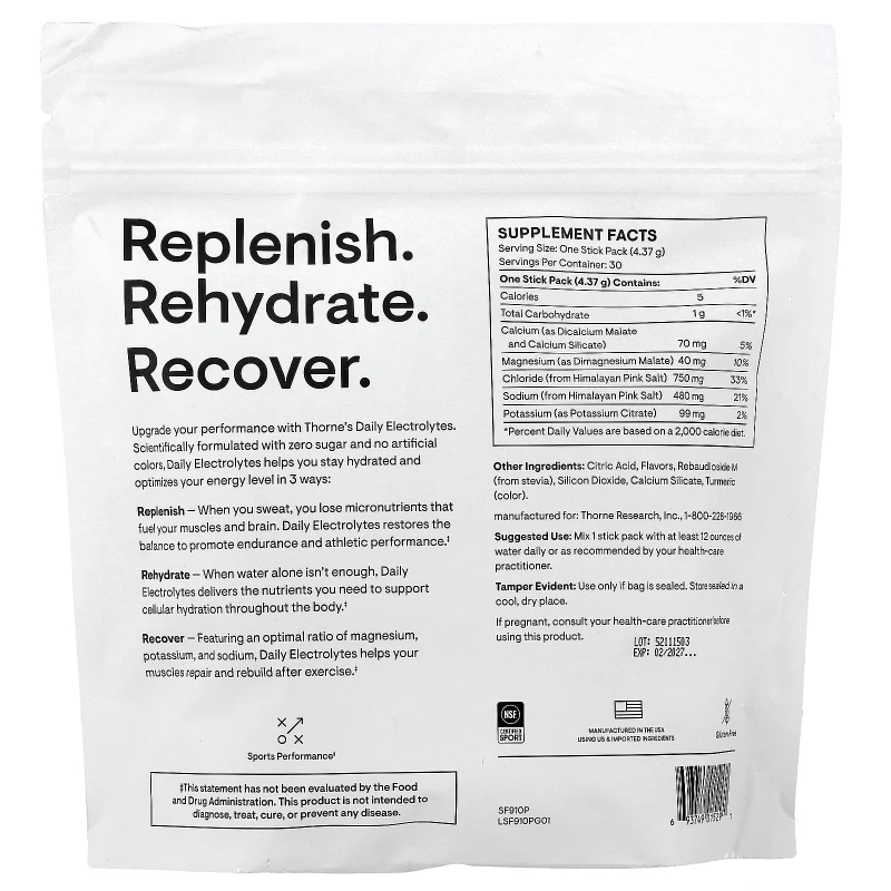 Los 30 sobres individuales ofrecen portabilidad máxima y dosificación precisa. Cada sobre se mezcla fácilmente con al menos 12 onzas (360 ml) de agua fría para obtener una bebida electrolítica lista en segundos. Son ideales para llevar al gimnasio, a competencias, en viajes o para cualquier situación donde se necesite rehidratación rápida y efectiva. Fabricados en Estados Unidos con los estándares de calidad de Thorne.