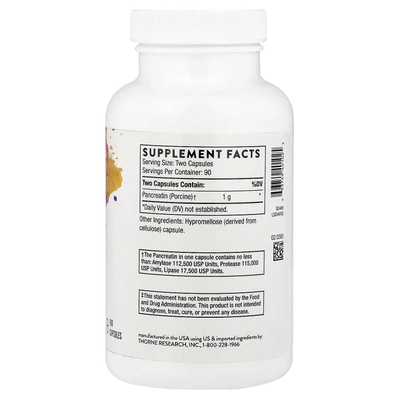 Cada cápsula contiene 500 mg de pancreatina de alta potencia en una cápsula de hipromelosa libre de gluten. La dosificación flexible de 1-2 cápsulas con cada comida permite ajustar la suplementación según el contenido graso y la complejidad de cada comida. Con 180 cápsulas por frasco, un frasco puede durar entre 2 y 3 meses dependiendo de la frecuencia de uso. Fabricado en Estados Unidos bajo los estrictos estándares de Thorne.
