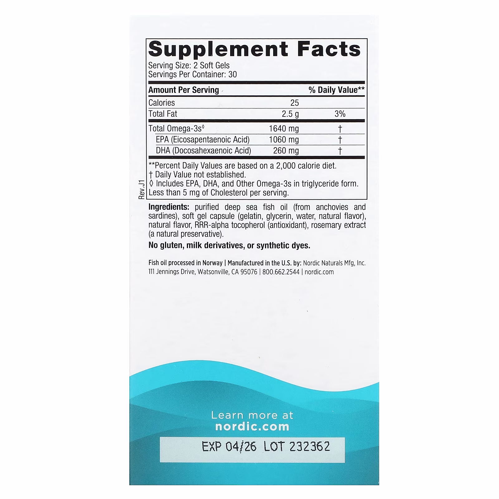 Nordic Naturals es líder mundial en omega-3, con más de 25 años de experiencia. Todos sus productos se fabrican en Noruega bajo estándares de pureza que superan las normas internacionales. Cada lote se somete a pruebas de terceros para verificar la ausencia de metales pesados, PCB, dioxinas y otros contaminantes ambientales.