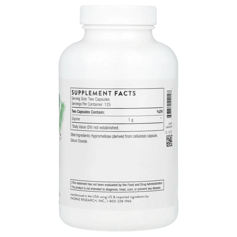 La Glicina de Thorne proporciona 1 g de glicina pura por porción de 2 cápsulas, en un envase de 250 cápsulas que rinde 125 porciones. La glicina es el aminoácido más pequeño y abundante del cuerpo humano, con funciones que abarcan desde la neurotransmisión inhibitoria hasta la síntesis de colágeno y la desintoxicación hepática.