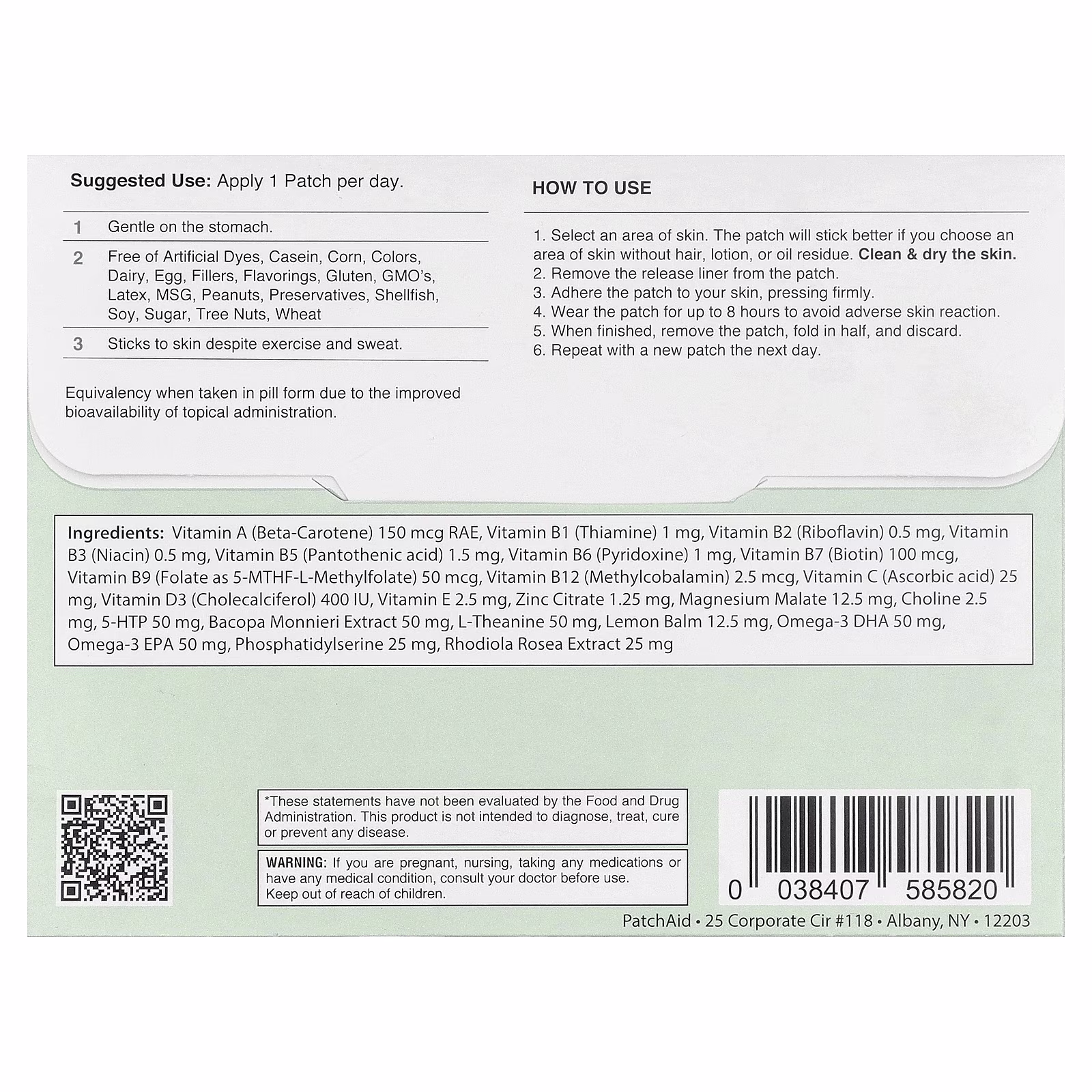 150 mcg de vitamina A (beta-caroteno) RAE., 1 mg de vitamina B1 (tiamina), 0,5 mg de vitamina B2 (riboflavina), vitamina B3 (niacina): 0,5 mg, 1,5 mg de vitamina B5 (ácido pantoténico), 1 mg de vitamina B6 (piridoxina), 100 mcg de vitamina B7 (biotina), vitamina B9 (folato en forma de 5-MTHF-L-metilfolato) 50 mcg, 2,5 mcg de vitamina B12 (metilcobalamina), 25 mg de vitamina C (ácido ascórbico), vitamina D3 (colecalciferol), 400 UI, 2,5 mg de vitamina E, citrato de zinc, 1,25 mg, 12,5 mg de malato de magnesio, 2,5 mg de colina, 50 mg de 5-hidroxitriptófano (5-HTP), extracto de Bacopa monnieri, 50 mg, 50 mg de L-teanina, Toronjil (12,5 mg), omega-3 DHA, 50 mg, 50 mg de omega-3 EPA, 25 mg de fosfatidilserina, 25 mg de extracto de Rhodiola rosea.