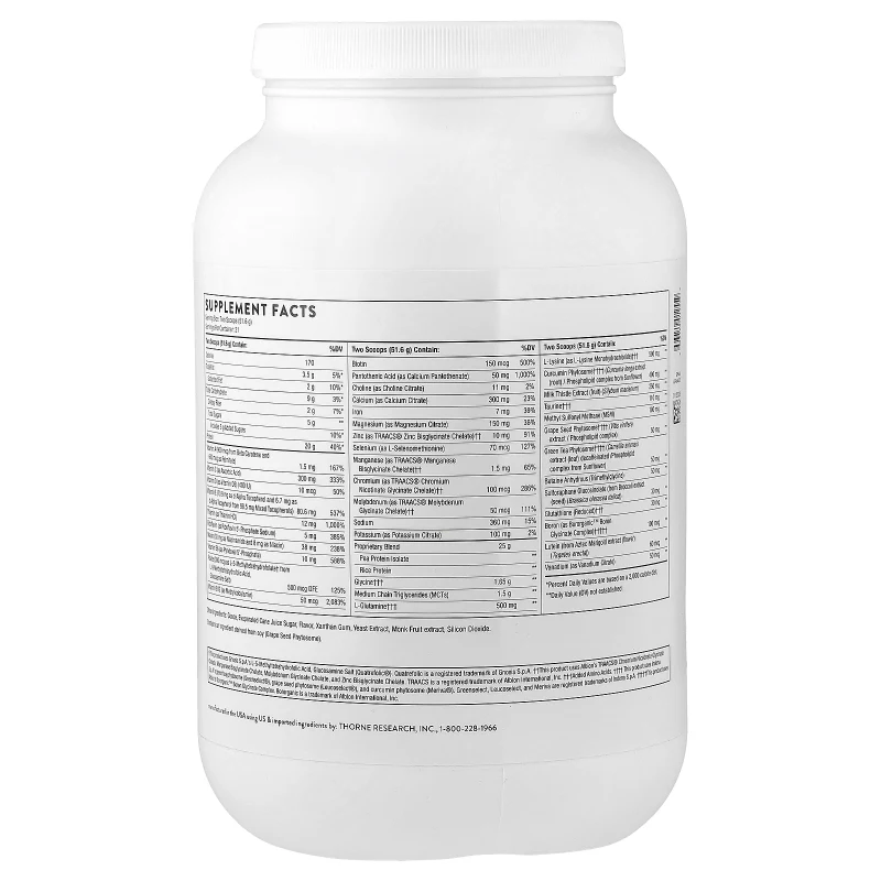 Mezclar una porción (dos cucharadas) con al menos 10 onzas de agua fría, jugo, leche de arroz o leche de nuez. Apto para adultos y niños mayores de 12 años. El frasco de 1.083 g proporciona aproximadamente 14 porciones. Fabricado en Estados Unidos como fórmula exclusiva de Thorne (T Exclusive). Contiene ingrediente derivado de soja (fitosomal de semilla de uva).