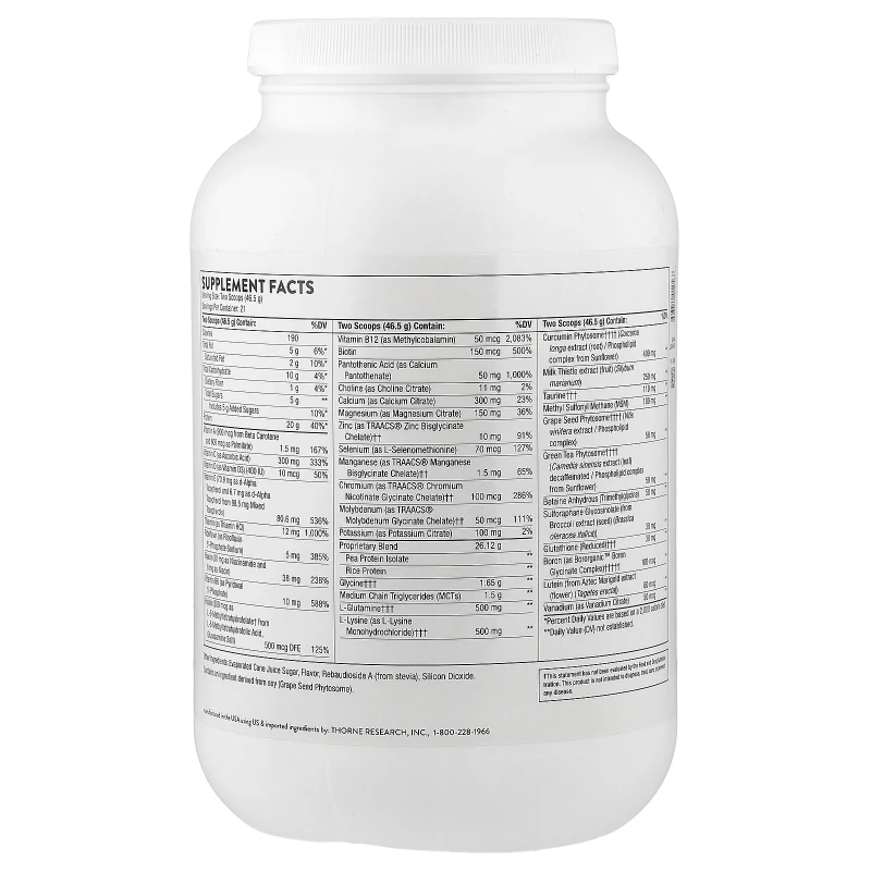 Mezclar una porción (dos cucharadas) con al menos 10 onzas de agua fría, jugo, leche de arroz o leche de nuez. El frasco de 977 g proporciona aproximadamente 14 porciones. Certificado NSF Contents Certified. Contiene ingrediente derivado de soja (fitosomal de semilla de uva). Fabricado en Estados Unidos como exclusiva de Thorne (T Exclusive). Libre de gluten.