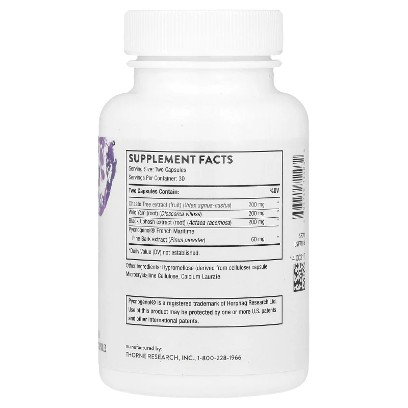 Thorne aplica los mismos estándares rigurosos de manufactura cGMP a esta fórmula botánica que a todos sus productos. Cada lote es verificado para potencia, pureza y ausencia de contaminantes. Las cápsulas de hipromelosa son libres de gluten y los ingredientes han sido seleccionados para minimizar el riesgo de reacciones adversas.