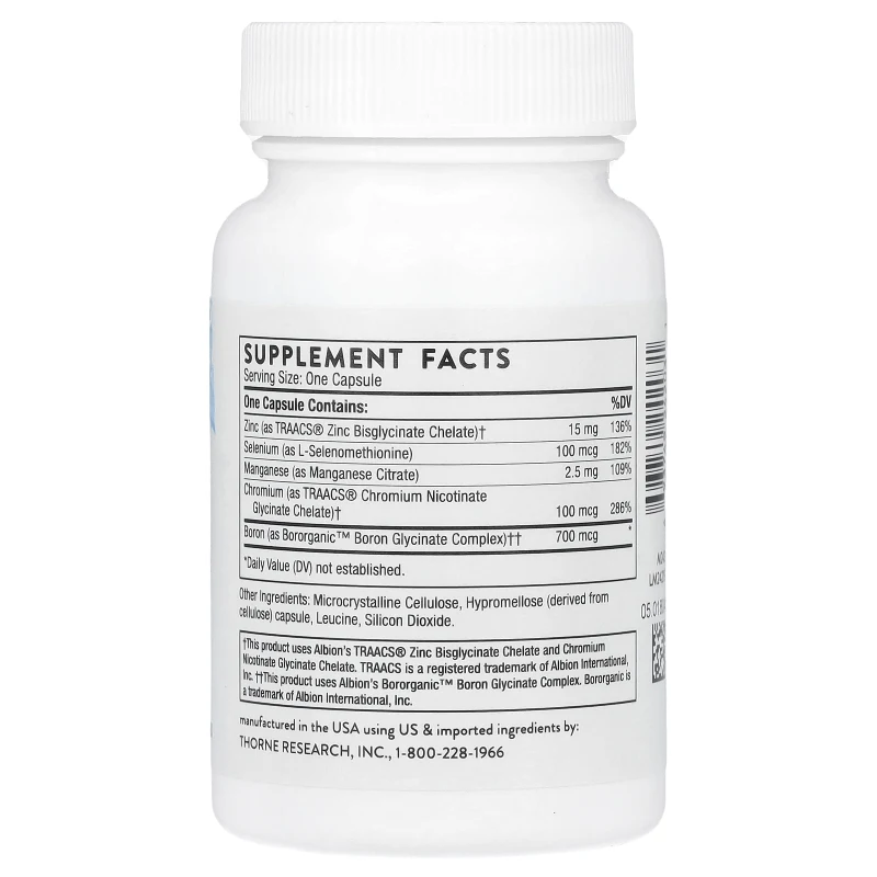 Trace Minerals de Thorne es una formulacion integral que reune los cinco minerales traza mas criticos para la salud humana: zinc, selenio, cromo, manganeso y boro. Lo que distingue a esta formula es el uso de formas queladas y organicas de alta absorcion, incluyendo la tecnologia patentada TRAACS de Albion para zinc y cromo, que garantiza una biodisponibilidad superior.