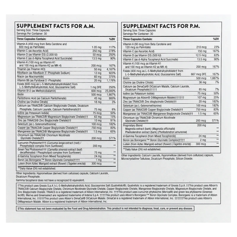 Tomar 3 cápsulas de la fórmula A.M. por la mañana y 3 cápsulas de la fórmula P.M. por la noche, diariamente con una comida o según indicación de su profesional de salud.
