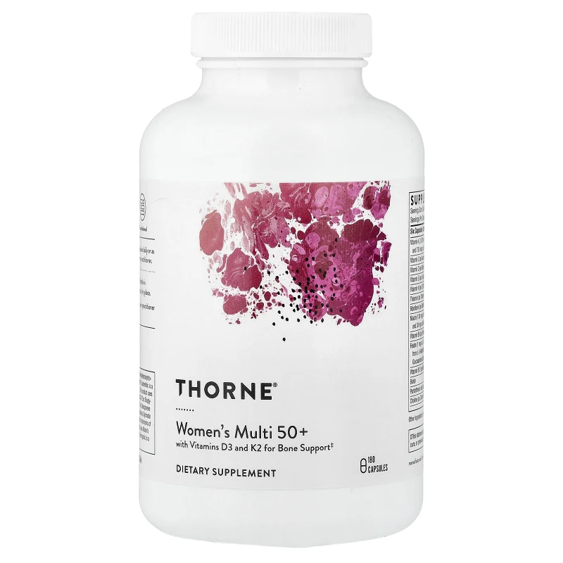 Women's Multi 50+ de Thorne es un multivitamínico integral formulado específicamente para las necesidades nutricionales de mujeres en etapa de perimenopausia y posmenopausia. Contiene 23 nutrientes cuidadosamente seleccionados, incluyendo vitaminas D3 y K2 para soporte óseo, formas metiladas de vitaminas B para energía y metabolismo, y minerales quelados para absorción óptima. A diferencia de los multivitamínicos genéricos, esta fórmula reconoce que las necesidades nutricionales cambian significativamente después de los 50 años.