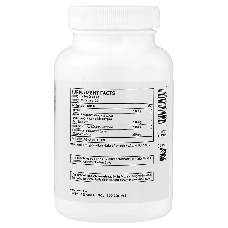 Phytoprofen es una fórmula antiinflamatoria natural de Thorne que combina tres hierbas ayurvédicas con siglos de uso tradicional y respaldo científico moderno: jengibre, boswellia y curcumina. Diseñada para minimizar la inflamación post-operatoria o post-lesión, reducir la hinchazón y prevenir la degradación del tejido conectivo, Phytoprofen ofrece una alternativa natural a los antiinflamatorios convencionales con un perfil de seguridad superior para uso a largo plazo.