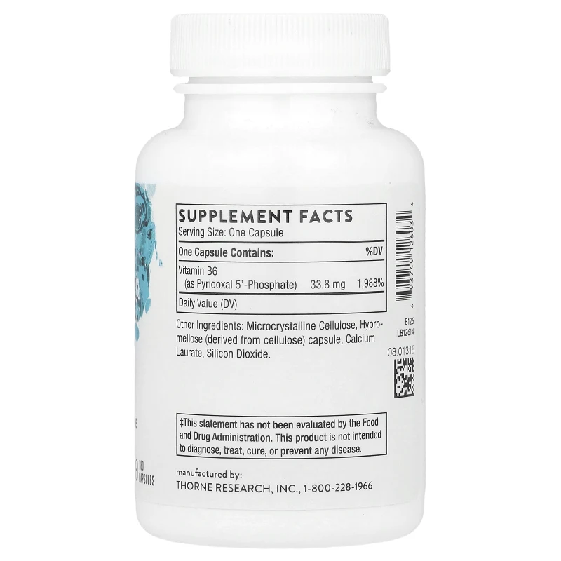 Thorne encapsula el P5P en cápsulas de hipromelosa libre de gluten, con excipientes mínimos: celulosa microcristalina, laurato de calcio y dióxido de silicio. El formato de 180 cápsulas ofrece un suministro prolongado, especialmente valioso para quienes requieren suplementación continua de B6 como parte de su protocolo de salud.