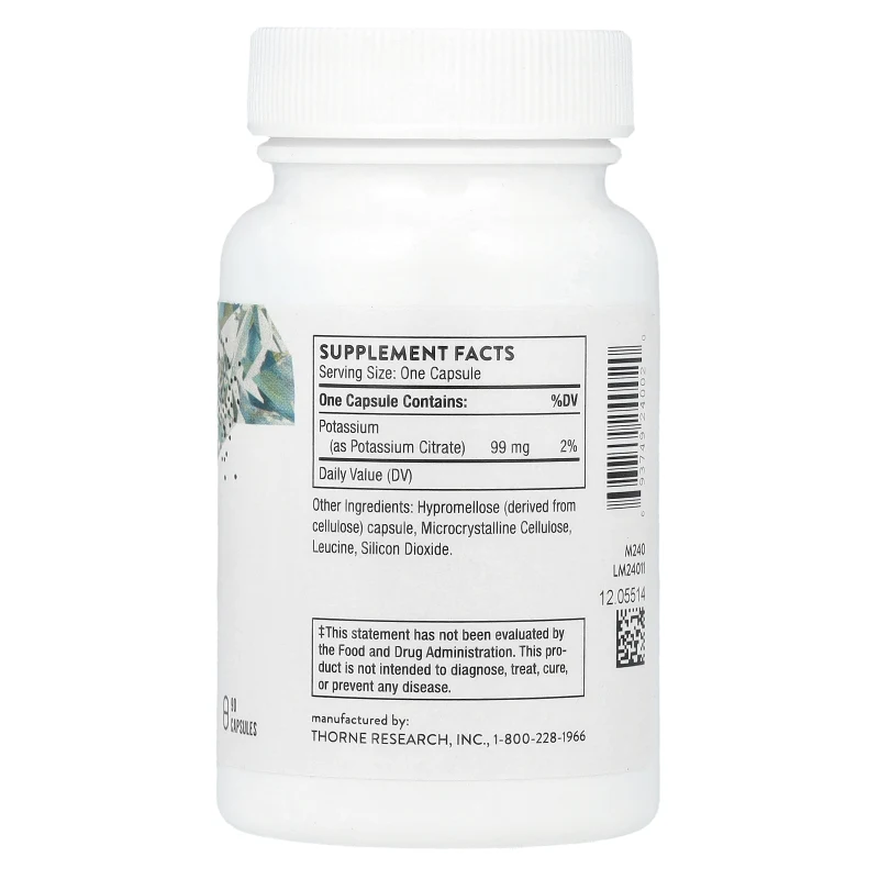 El Citrato de Potasio de Thorne proporciona 99 mg de potasio elemental por cápsula en su forma de citrato, una de las formas más biodisponibles y mejor toleradas de este mineral esencial. El potasio es el principal catión intracelular del cuerpo humano y participa en funciones vitales que incluyen la contracción muscular, la conducción de impulsos nerviosos, el equilibrio de fluidos y la función cardiovascular normal.