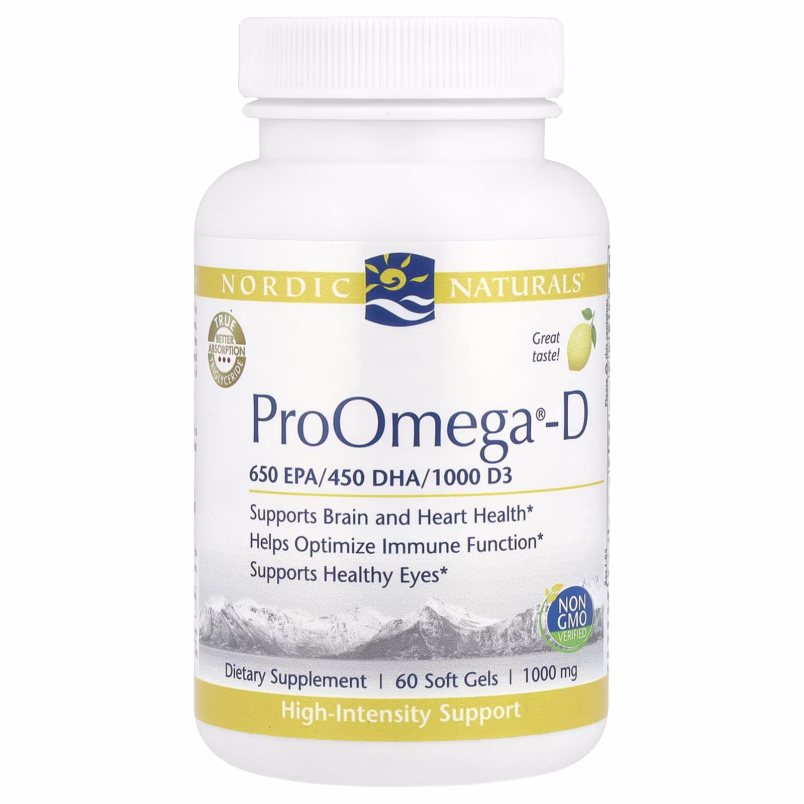 ProOmega®-D, Sabor a Limón, 60 Cápsulas Blandas de Nordic Naturals es un suplemento de omega-3 de grado farmacéutico elaborado con aceite de pescado concentrado de aguas frías. Formulado para ofrecer una dosis óptima de EPA y DHA en forma de triglicéridos, la forma natural más biodisponible que el cuerpo reconoce y absorbe con facilidad.