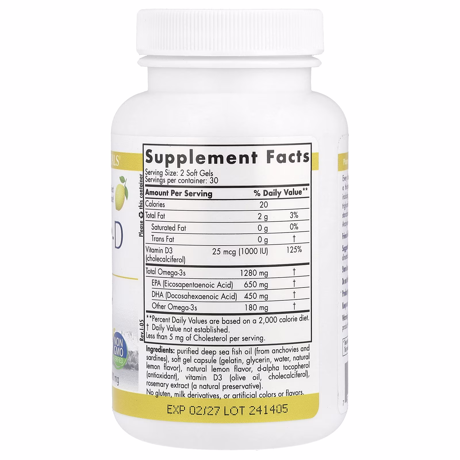 Aceite de pescado purificado de aguas profundas (de anchoas y sardinas), cápsulas blandas cápsulas (gelatina, glicerina, agua, saborizante natural de limón), saborizante natural de limón, d-alfa tocoferol (antioxidante), vitamin D3 (aceite de oliva, cholecalciferol), extracto de romero (un conservante natural). Sin gluten, sin derivados lácteos ni colorantes sintéticos. o flavors.