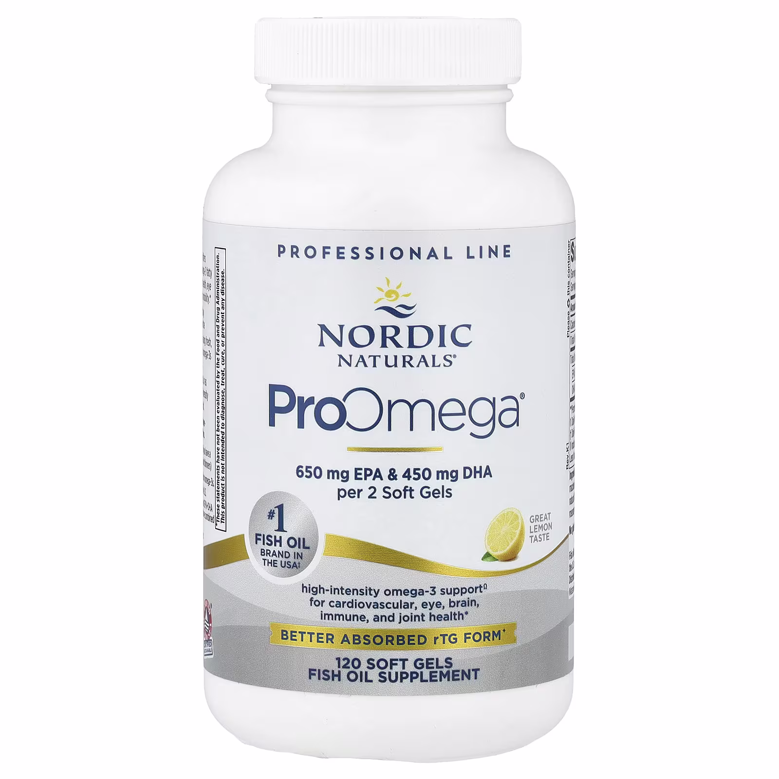 ProOmega®, Sabor a Limón, 120 Cápsulas Blandas (640 mg por Cápsulas Blandas) de Nordic Naturals es un suplemento de omega-3 de grado farmacéutico elaborado con aceite de pescado concentrado de aguas frías. Formulado para ofrecer una dosis óptima de EPA y DHA en forma de triglicéridos, la forma natural más biodisponible que el cuerpo reconoce y absorbe con facilidad.