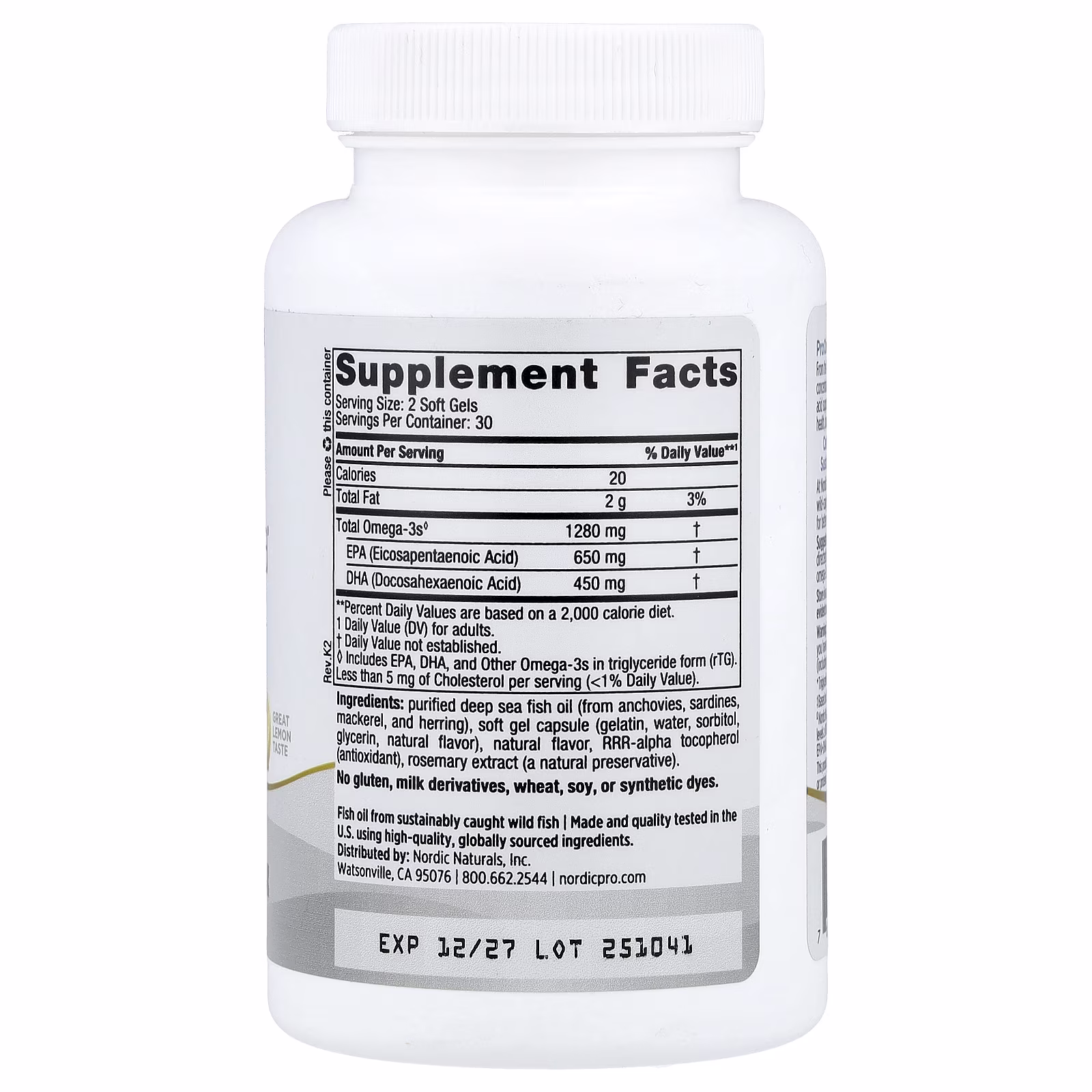 Nordic Naturals es líder mundial en omega-3, con más de 25 años de experiencia. Todos sus productos se fabrican en Noruega bajo estándares de pureza que superan las normas internacionales. Cada lote se somete a pruebas de terceros para verificar la ausencia de metales pesados, PCB, dioxinas y otros contaminantes ambientales.