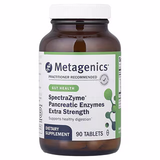 Las enzimas pancreáticas son las principales responsables de descomponer proteínas, carbohidratos y grasas en el intestino delgado. Cuando la producción endógena es insuficiente o la digestión necesita refuerzo, un suplemento de pancreatina puede apoyar el proceso digestivo completo. SpectraZyme® Pancreatic Enzymes de Metagenics ofrece una formulación de grado extra fuerte con 720 mg de pancreatina porcina estandarizada por tableta.