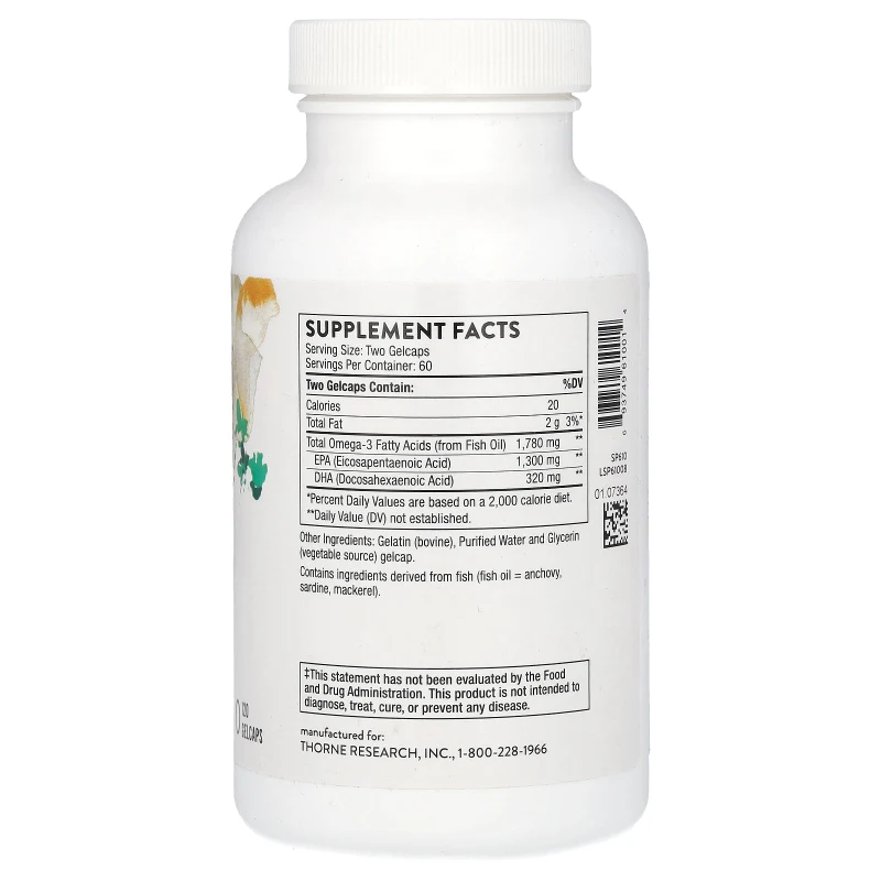 Thorne somete su aceite de pescado a un proceso de purificación por destilación molecular que elimina contaminantes ambientales como mercurio, plomo, PCBs y dioxinas. El resultado es un aceite de pescado de grado farmacéutico que cumple con los estándares más exigentes de la industria. La encapsulación en gelcaps de gelatina bovina protege el aceite de la oxidación y facilita la ingesta sin retrogusto a pescado.