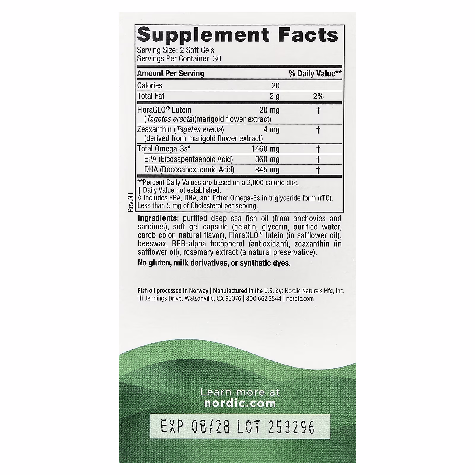 Aceite de pescado purificado de aguas profundas (de anchoas y sardinas), cápsulas blandas cápsulas (gelatina, glicerina, purified agua, carob color, saborizante natural), FloraGLO® Luteína (in Aceite de cártamo), cera de abeja, RRR-alfa tocoferol (antioxidante), zeaxanthin (in Aceite de cártamo), extracto de romero (un conservante natural). Sin gluten, sin derivados lácteos ni colorantes sintéticos. Este producto y sus ingredientes no contienen genes ni proteínas modificadas genéticamente.
