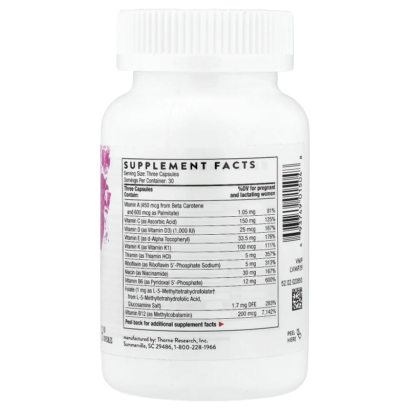 A diferencia de muchos prenatales que omiten la colina, Thorne incluye 110 mg de colina citrato. La colina es esencial para el desarrollo del cerebro y la médula espinal del bebé, la formación de membranas celulares y la prevención de defectos del tubo neural. Estudios recientes muestran que la mayoría de mujeres embarazadas no alcanzan la ingesta recomendada de colina solo con la dieta.