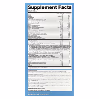 PhytoMulti: Microcrystalline celulosa, Croscarmelosa sódica, celulosa, Ácido esteárico (vegetable), coating [hipromelosa, Triglicéridos de cadena media, Hidroxipropilcelulosa, y sodium copper chlorophyllin (color)], y dióxido de silicio. OmegaGenics EPA-DHA 500 mg: Marine lipid concentrate [pescado (anchoa(s), sardina(s), y caballa) oil], cápsulas blandas shell (gelatina, glicerina, agua), Contiene 2 percent o less of saborizante natural de limón, mixed tocoferol (antioxidante), extracto de romero, y Palmitato de ascorbilo (antioxidante). Contiene: pescado (anchoa(s), sardina(s), y caballa). Testralin: Microcrystalline celulosa, Croscarmelosa sódica, coating [hydroxypropylmethylcellulose, medium-chaintriglycerides, Hidroxipropilcelulosa, y sodium copper chlorophyllin (color)], calcium silicate, Ácido esteárico (vegetable), y dióxido de silicio. Contiene: soja.HisSynergy: Microcrystalline celulosa, cápsulas (hydroxypropylmethylcellulose, agua, Sorbitol, y dióxido de silicio),estearato de magnesio (vegetable), y dióxido de silicio.Zinc A. G.: Microcrystalline celulosa, cápsulas (hydroxypropylmethylcellulose, agua, Sorbitol, dióxido de silicio), silicondioxide, y estearato de magnesio (vegetable).productos included are Libre de gluten.